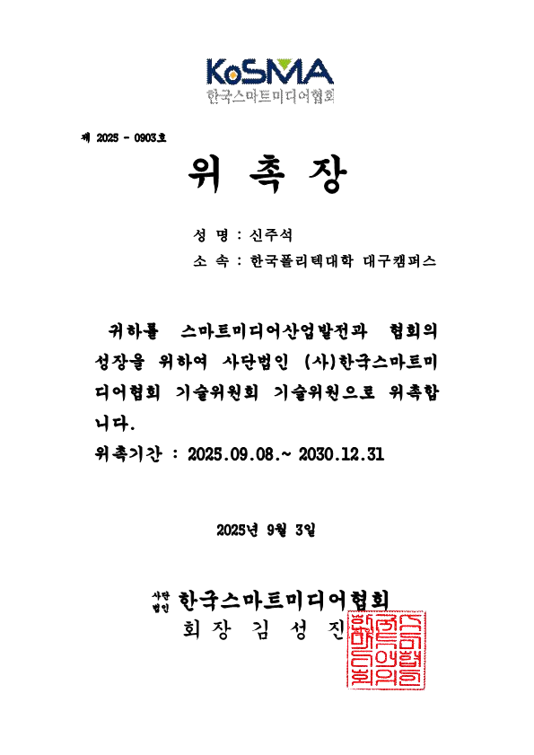 상기인을 협회 기술위원회 교육전문위원으로 위촉함을 안내드립니다.
