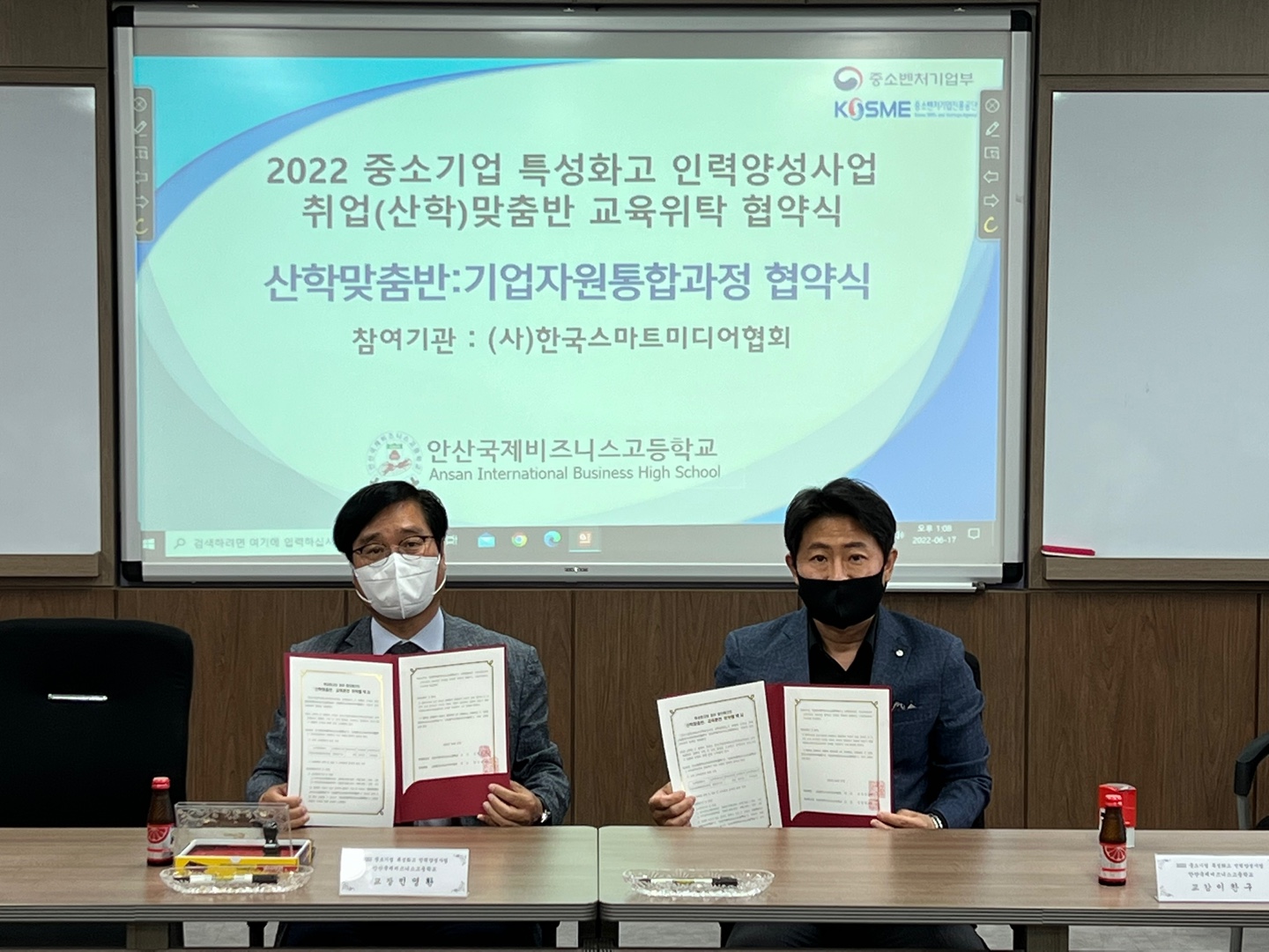기업자원통합과정 교육 위탁협약식 ( 안산국제비즈니스고 민영환 교장 , 한국스마트미디어협회 김성진 대표이사)